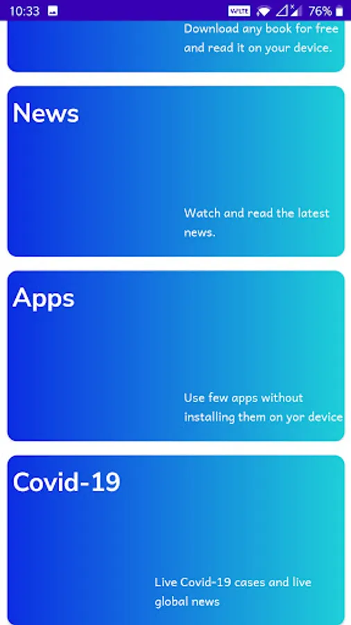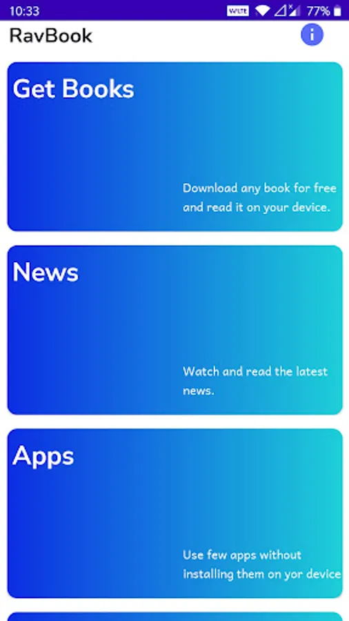 RavBook is a free android app that is very easy to use even a 5 years old kid can use RavBook. In RavBook you don’t need to sign in or sign up, the thing you need to do is to use it and enjoy it. The UI of RavBook is very clean and easy, it has an Home button which contains four buttons with an information logo/button on the top right corner of the home screen. In RavBook you can use the apps that consist of more than 100 Mbs is now available in just just three to four Mbs which fixes the problem of slow speed and less storage of your android device, In RavBook you can download any book for free as PDF also read and watch news in the app through CNN, Fox news and many more.