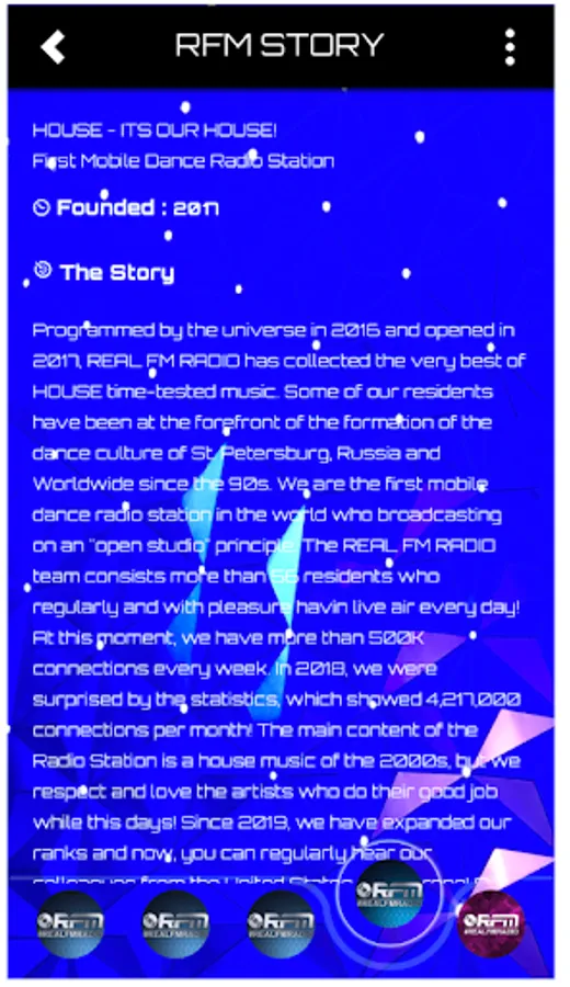Запрограммированная вселенной в 2016 и открытая в 2017, радиостанция REAL FM RADIO собрала в себе самое лучшее из мира HOUSE музыки, проверенной временем. Часть наших резидентов стояли у истоков становления танцевальной культуры Санкт-Петербурга, России и Мира еще в 90х годах. Мы - первая мобильная танцевальная радиостанция в Мире, вещающая по принципу "открытой студии". Команда REAL FM RADIO - это 56 резидентов, кто регулярно и с удовольствием выходит в прямой эфир каждый день, для Вас! В 2018 году, мы удивились статистике, что показала 4 217 000 подключений за месяц! Основной контент станции House музыка 2000х, но мы не меньше уважаем и любим артистов, кто вносит свою лепту и по сей день! С 2019 года, мы расширили свои ряды и теперь, Вы регулярно можете слышать наших коллег из США! Благодаря собственному приложению, Вы можете оставаться с нами в любой точке планеты! Вообщем HOUSE - это наш HOUSE (и Ваш) !