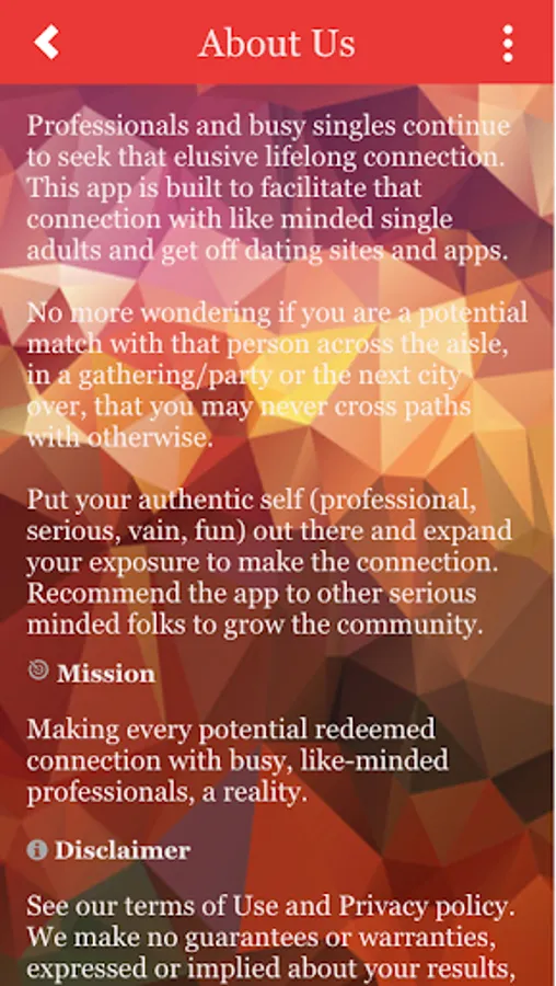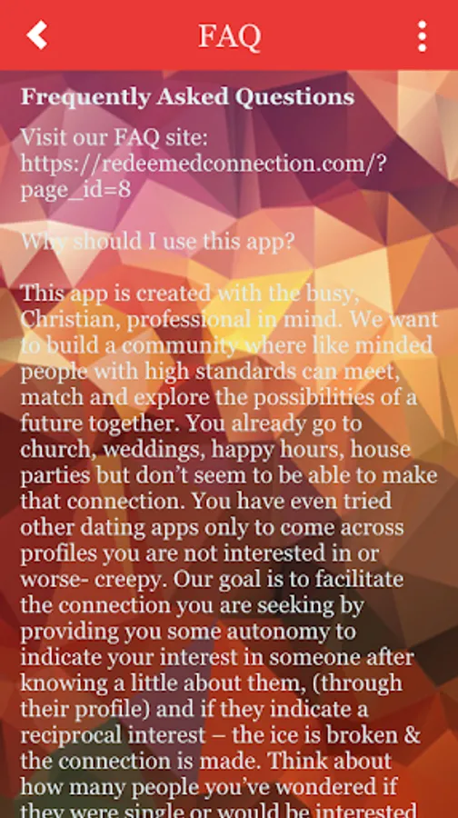 RedeemedConnection a.k.a Redeemed Connection app is built to facilitate the connection with like-minded, busy, single adults and get off dating sites and apps. The profile questions are intended to help you and potential matches get a better sense of each other's personalities.