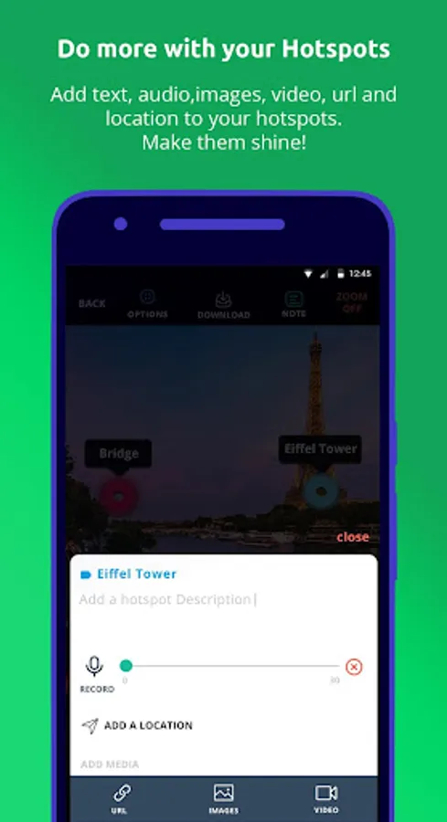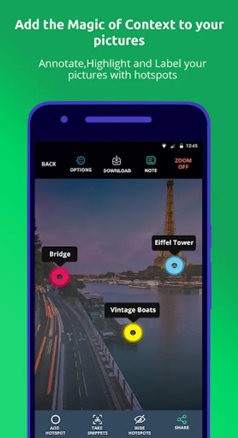 Highlight an area, object or a person in your pictures and add a 'Hotspot' to it. Add text, urls, audio, or video to these hotspots and create rich media content. Share the enriched experience with the world.