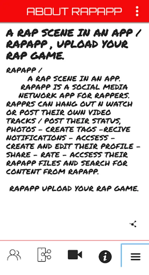 RAPAPP - RAPPERS CAN HANG OUT / UPLOAD VIDEO TRACKS / POST PHOTOS / SHARE / LIKE / ADD TAGS / CREATE AND EDIT THEIR PROFILE / BLOCK USER OR JUST POST THEIR STATUS