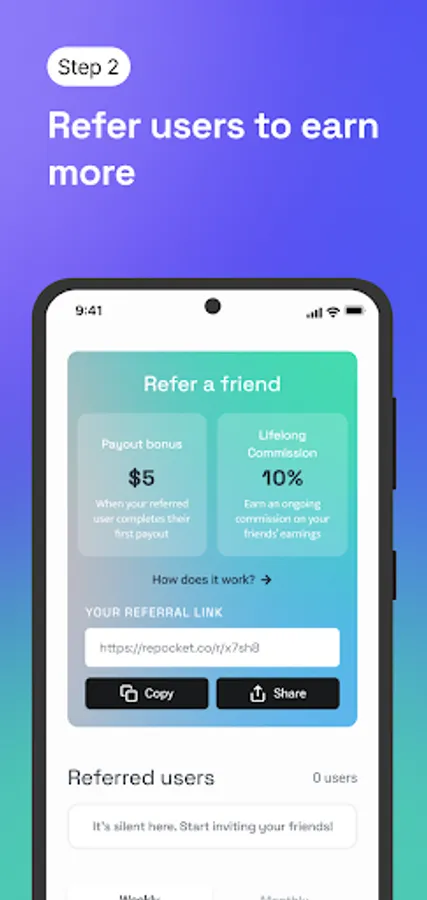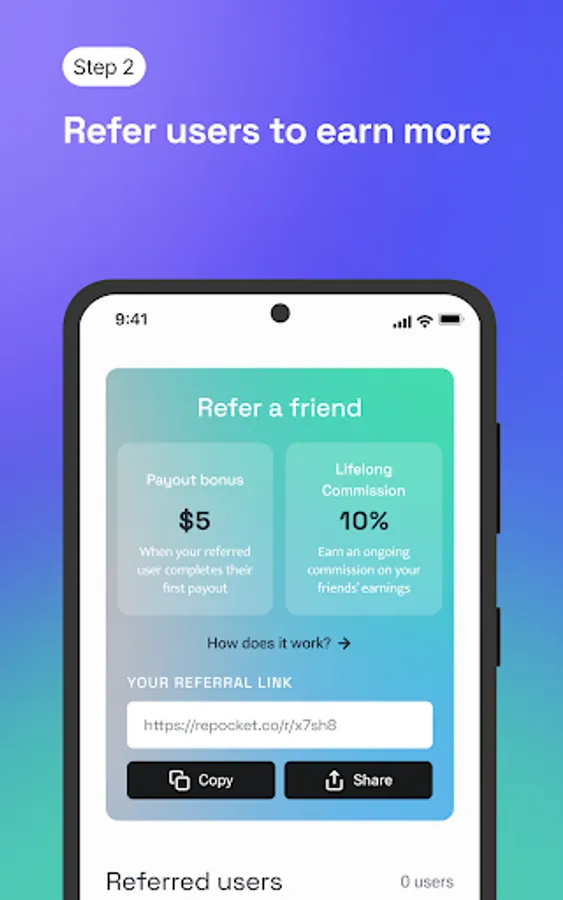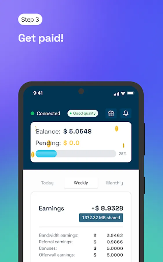 Receive a $5 bonus and a 10% lifetime commission on all referred users. Once you reach $20 in earnings you can withdraw your earnings. The more, the merrier! You can add more devices and refer more users to maximize your earnings. There is no limit on earnings, so refer to as many users as possible.