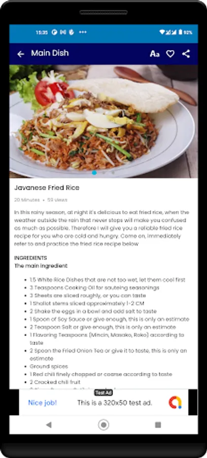 in the recipe feature there is a picture of the food and then the title of the food recipe. there are also ingredients from food recipes and there is also a description of what the meaning of the food is and also things that must be done and not done