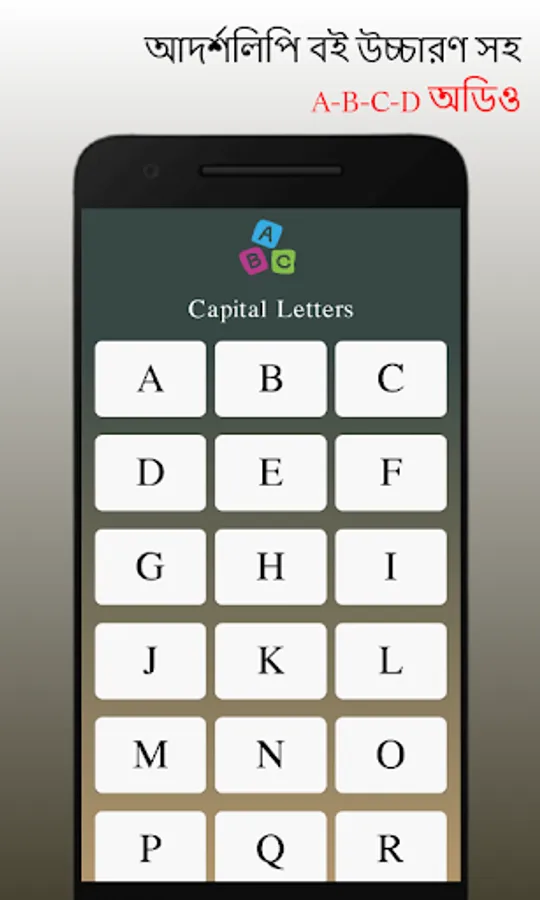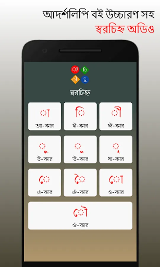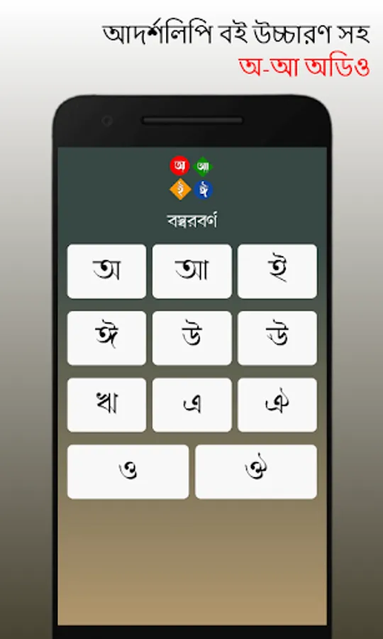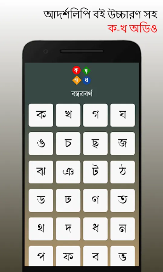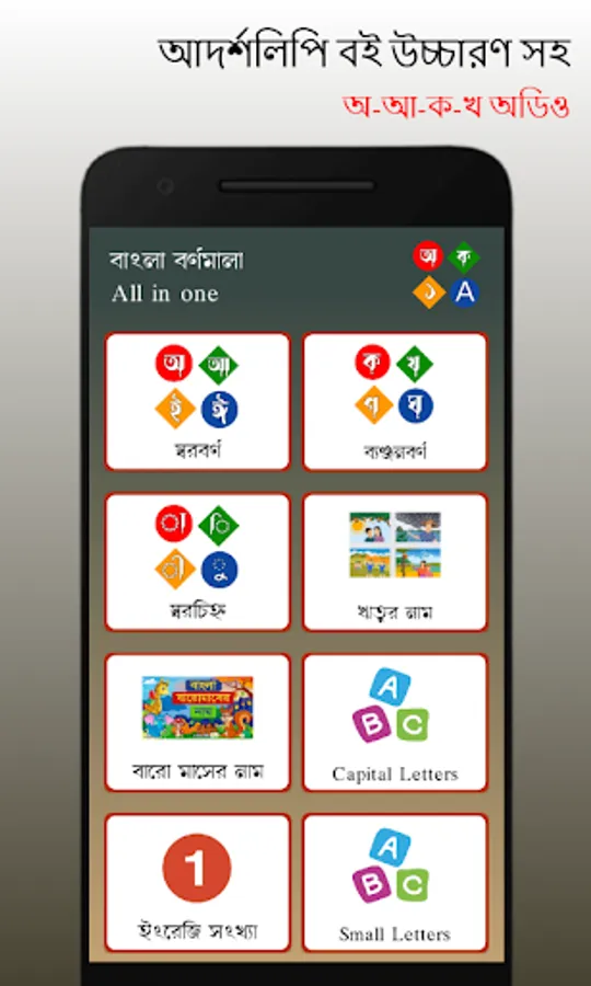 এই অ্যাপ্লিকেশনটিতে আপনি পাবেন অ-আ-ক-খ এবং আরো অনেক কিছুর অডিও যা আপনার বাচ্চার বর্ণমালা শেখার ক্ষেত্রে অনেক সুবিধা জনক ।