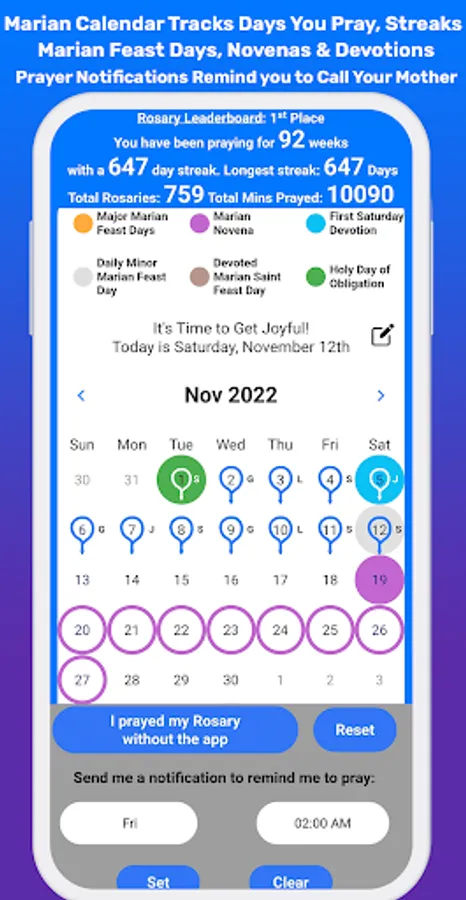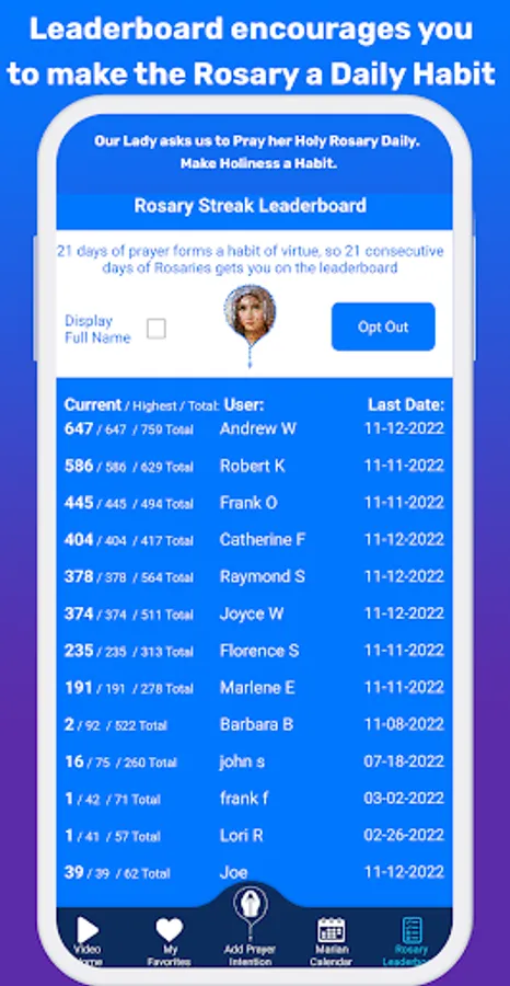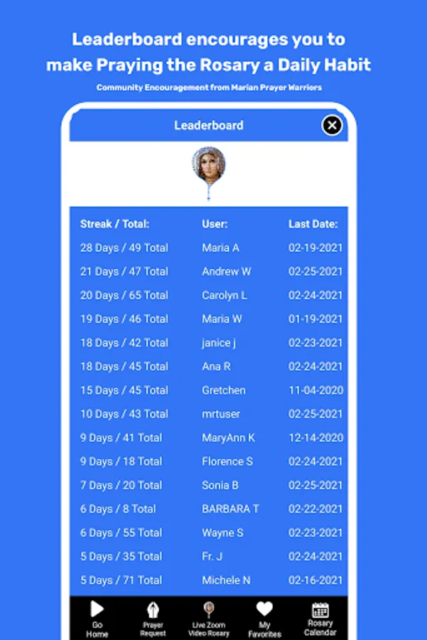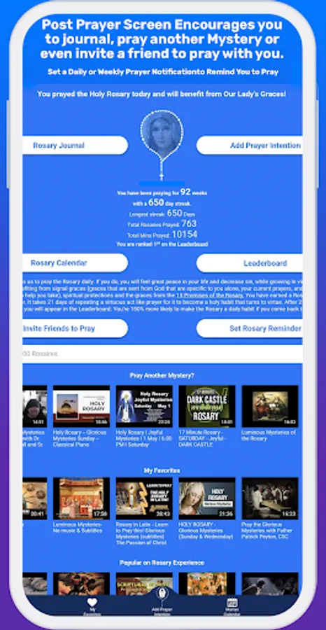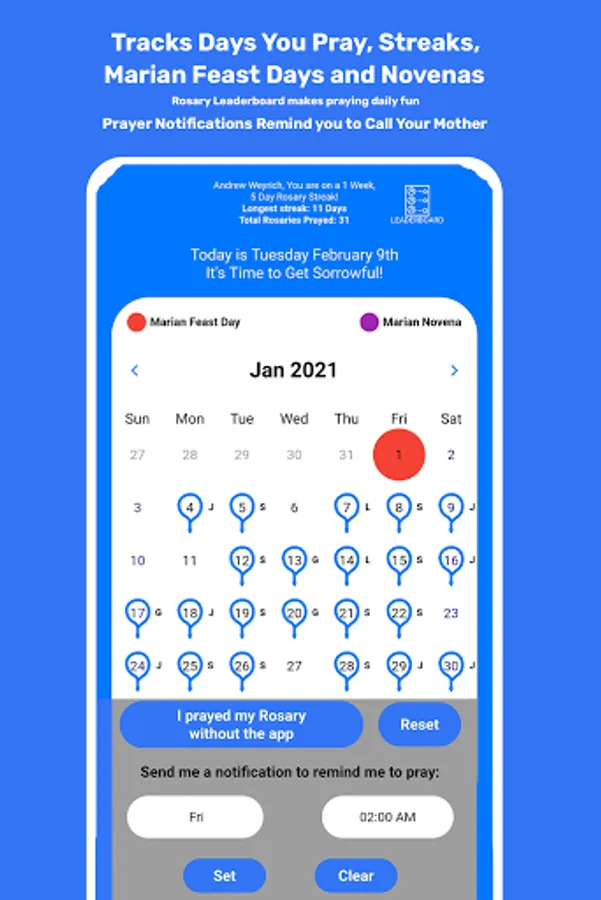 - Keep track of your Rosary prayer streaks as well as Rosary Leaderboard