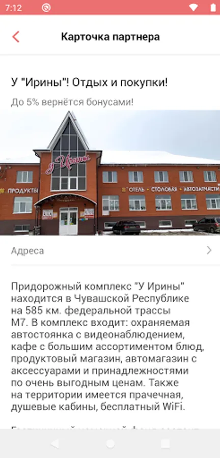 The "Please" application has been developed especially for guests of the roadside complex "U Irina", which is located in the Chuvash Republic at 585 km. federal highway M7. Users of the "Please" application can receive bonuses for purchases, maintain their personal profile and purchase history, as well as share their opinions about goods and services.