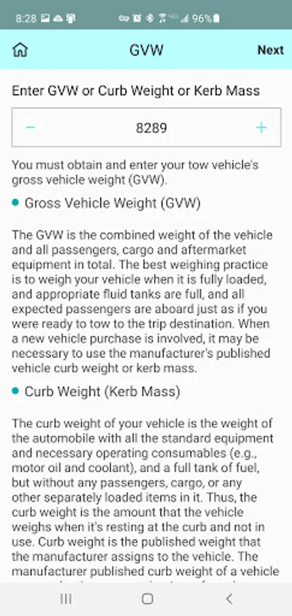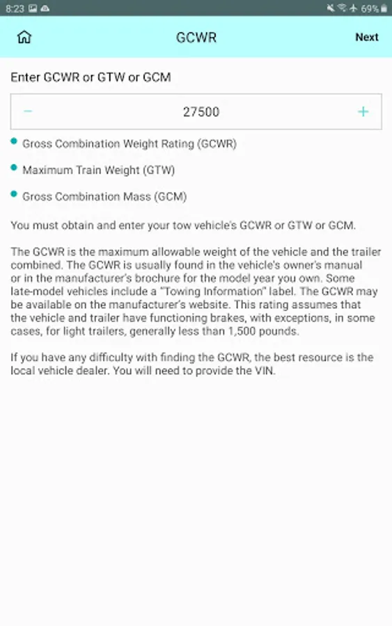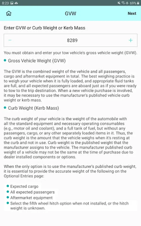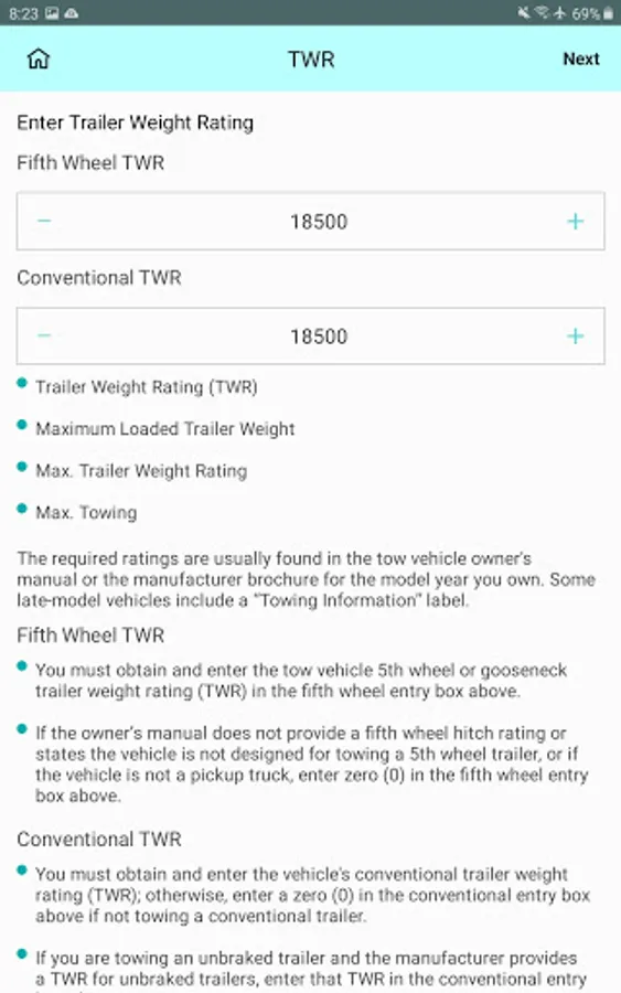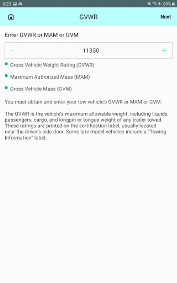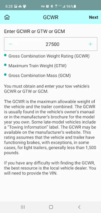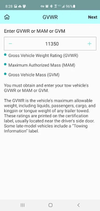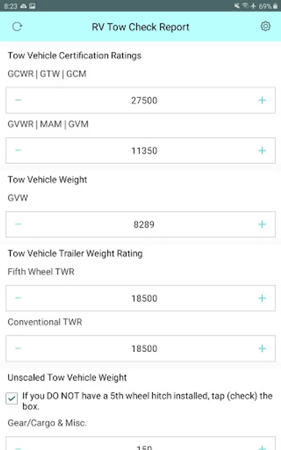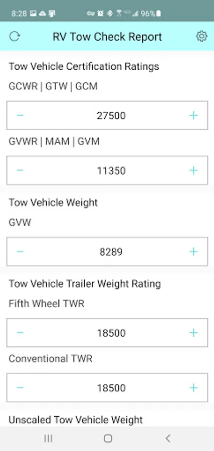 RV Tow Check requires four weight inputs from the tow vehicle. The required entries are gross combination weight rating (GCWR), gross vehicle weight rating (GVWR), gross vehicle weight (GVW), and trailer weight ratings (TWR).