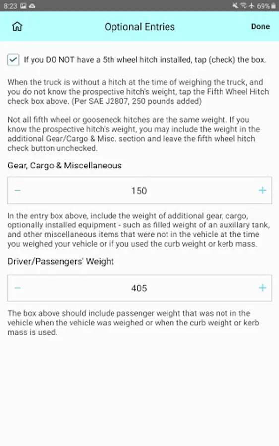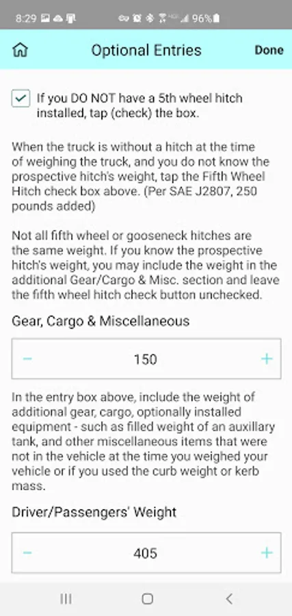 RV Tow Check users may include any additional unscaled weight for cargo, aftermarket equipment, and passenger weight. The app does not assume everyone weighs 150 or 175 pounds as the manufacturers do.
