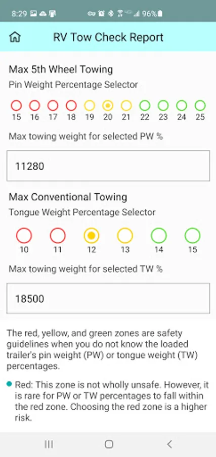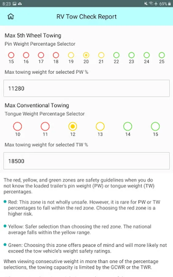 RV Tow Check provides instant max towing capacity results as the user selects various kingpin or tongue weight percentages.