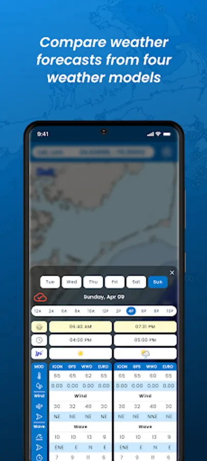 Weather forecasts are provided by four of the most accurate weather models available and are viewed side-by-side. Forecasts are available by the hour out to 6 days and provide information on sunrise/sunset, weather forecasts including air temperature, precipitation, wind speed and direction, wave height, direction and period.