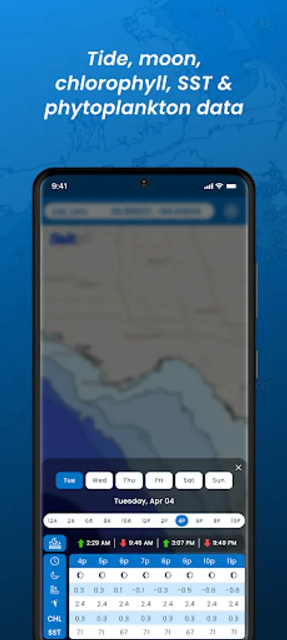 Ocean Conditions are provided by the GFS model and provide forecasts out to 6 days. Information provided include daily high and low tides, hourly tide height change, moon phase, phytoplankton density, chlorophyll-a concentration, and sea surface temperature.