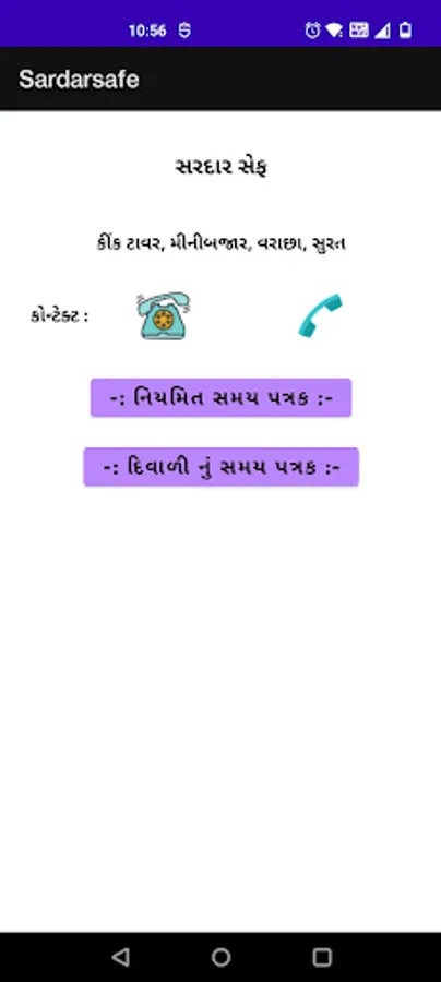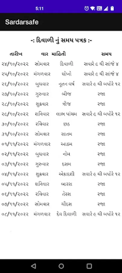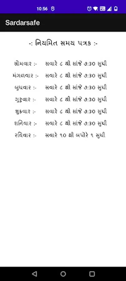 This application is use full for Sardarsafe users. They get information about sardarsafe's opening & closing time details. During festival safe's open & close time schedule different than regular time.