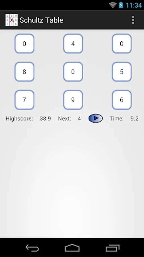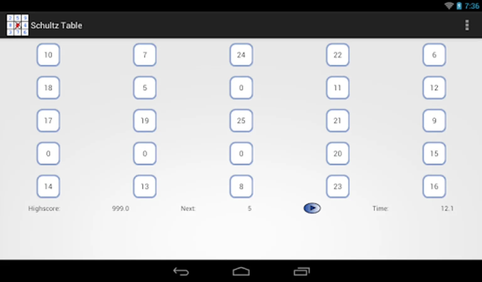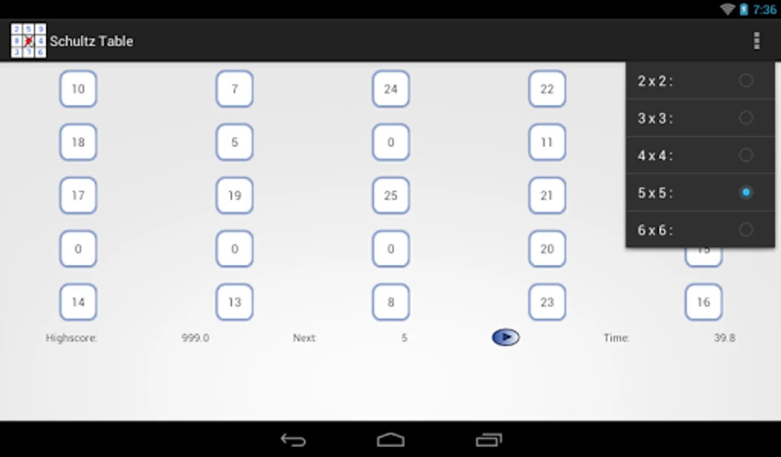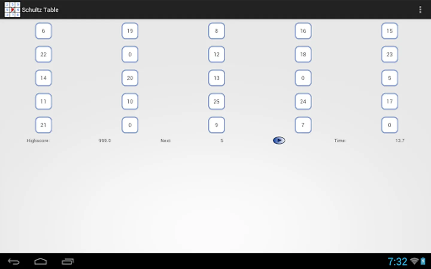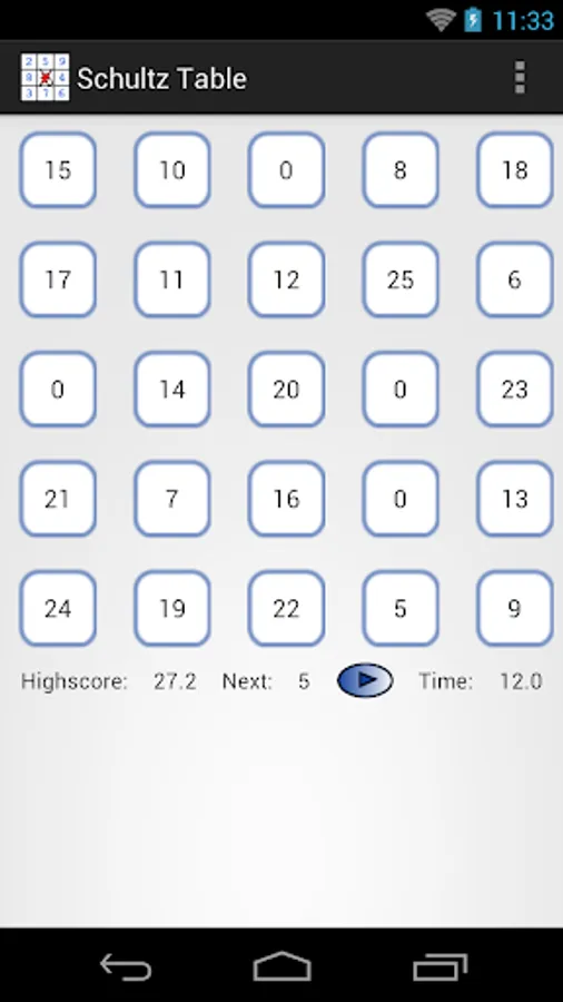Select the size of the table. Set eyes on the center of the table. Press the button. Search for numbers in ascending order. Do not move your eyes. Compare the result with your best result.