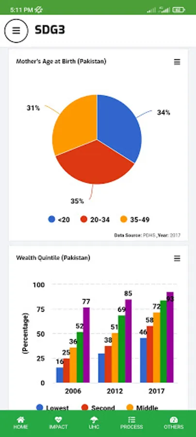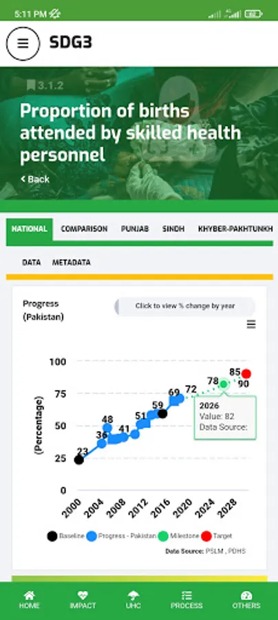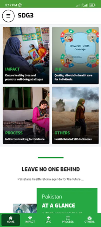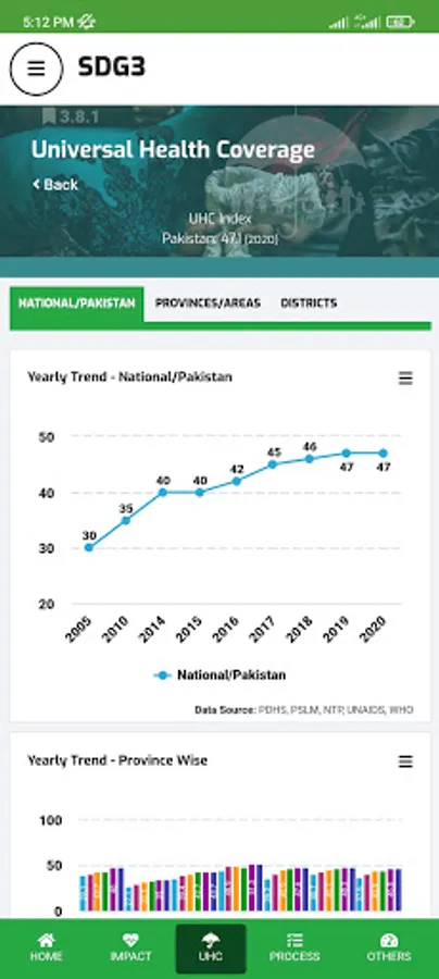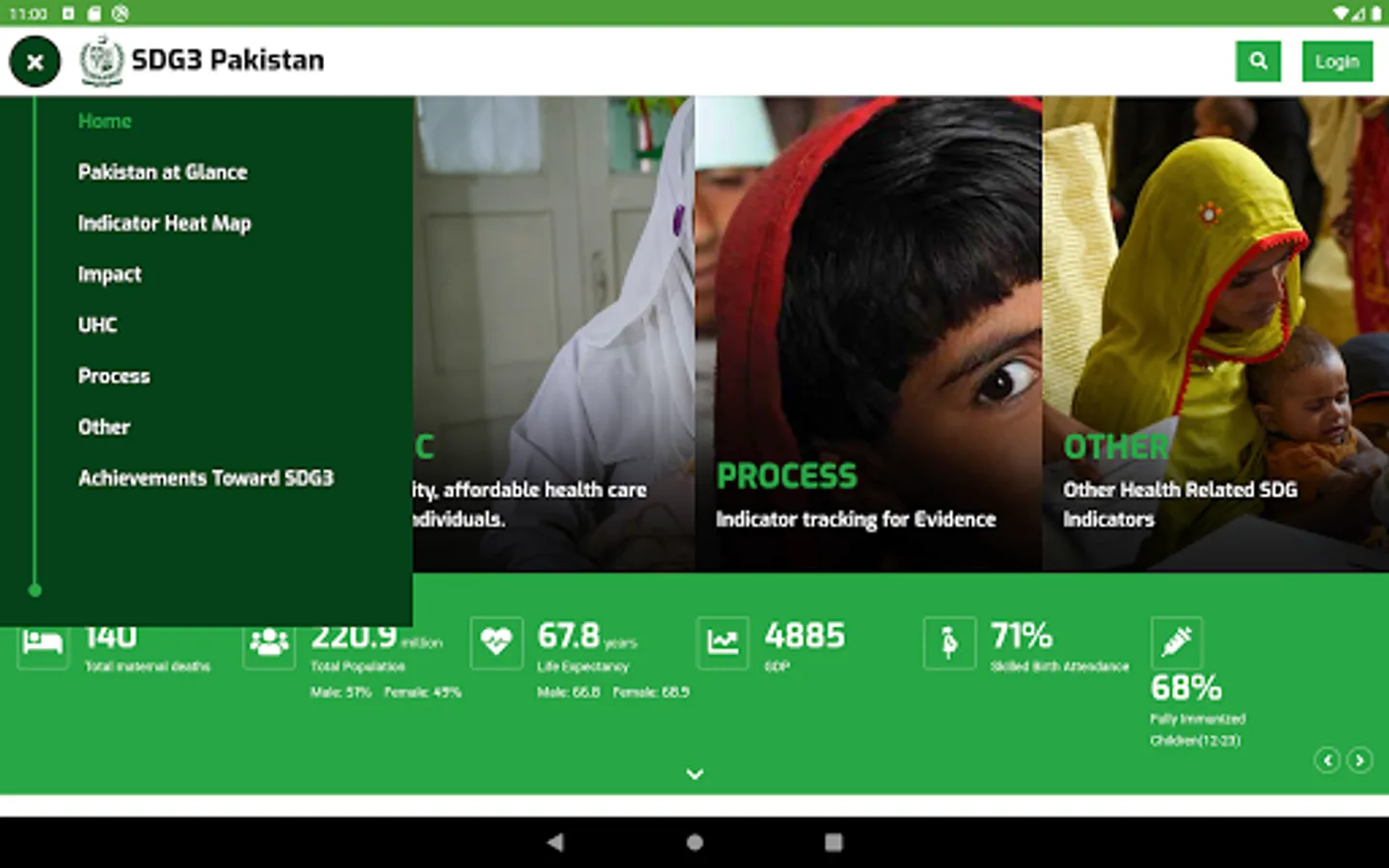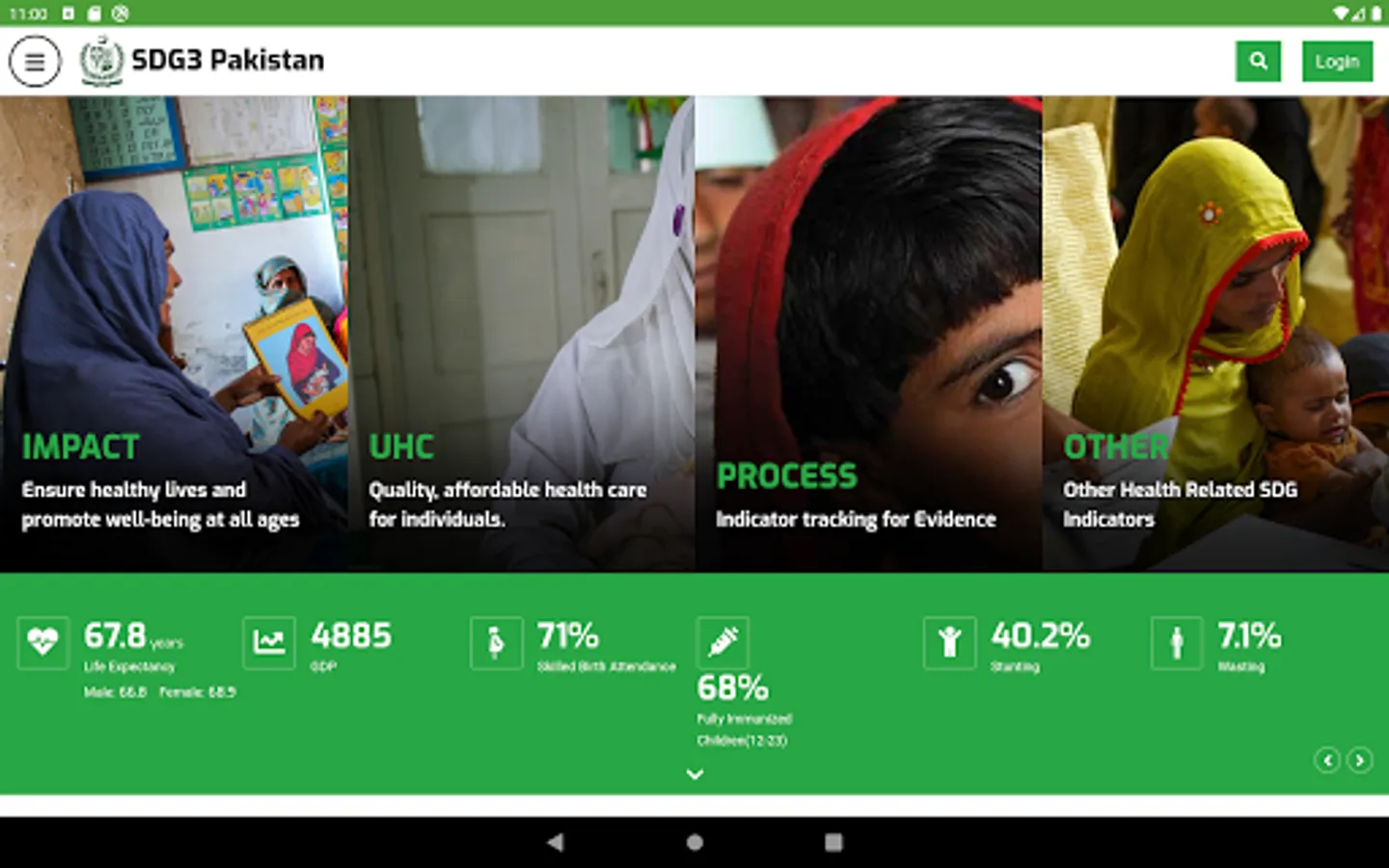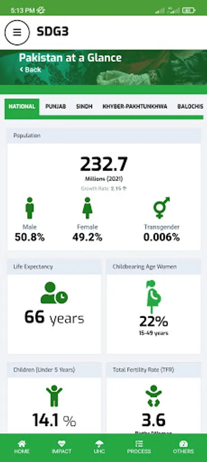 Ministry of National Health Services, Regulation, and Coordination (MoNHSR&C) as well as Provincial Health Departments are working for SDG-3 implementation in Pakistan. Under this, the localization of SDG-3 global targets and indicators for Pakistan was completed and endorsed in 2018 through a multi-stakeholder consultative and consensus building process at the national and the provincial level under the leadership of MoNHSR&C. A National level web-based dashboard and Android App (SDG3 Pakistan) and IOS app were developed and published here to reflect the progress status of the health-related SDGs in Pakistan including localized indicators, baseline, and targets for informed policymaking.
