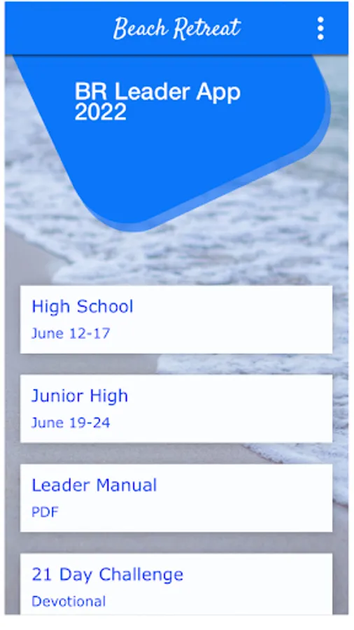The Beach Retreat Leader app allows the BR staff team to easily push out information to all beach retreat leaders. We will use this to facilitate communication with beach retreat leaders.