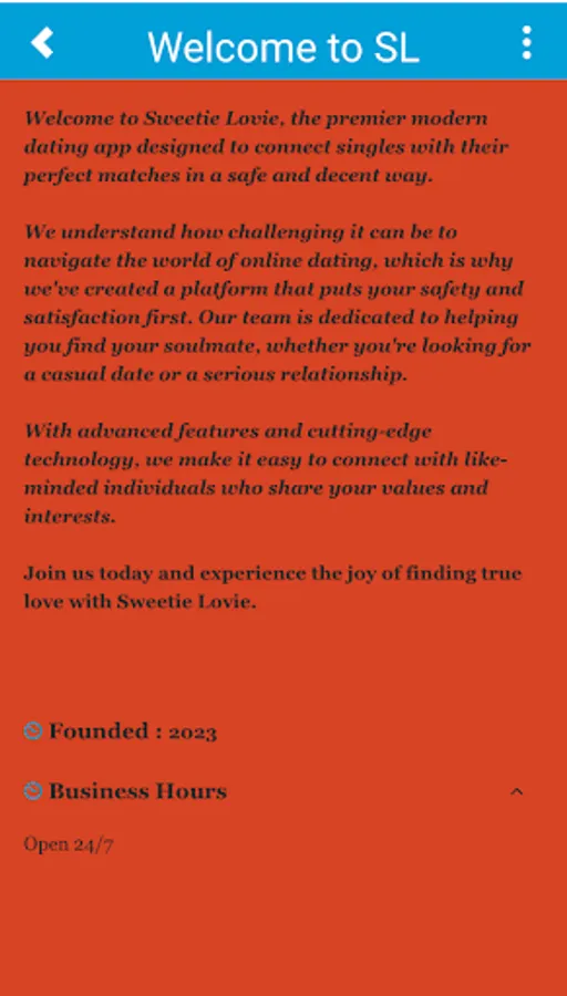 Sweetie Lovie is the ultimate modern dating app that connects singles with their perfect matches worldwide. Our platform prioritizes safety, authenticity, and satisfaction, offering advanced features and state-of-the-art technology to make finding true love easy and enjoyable. With Sweetie Lovie, you can trust that you're in good hands and can confidently explore the world of online dating. Join us today and start your journey to finding your soulmate