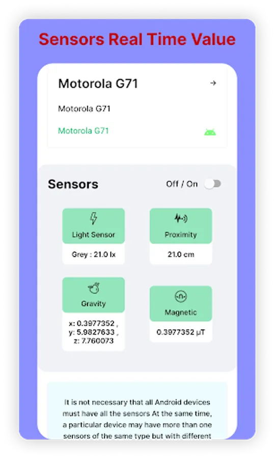 Detailed information and real-time readings for magnetic, gravity, proximity, and light sensors.
