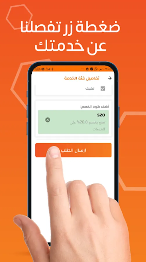 · بضغطة زر واحدة تستطيع طلب إحدى الخدمات الخاصة بالمنشآت أو المنازل وسيتم إرسال مختص بسيارة مجهزة بكافة الأدوات اللازمة لتقديم خدمة متكاملة.