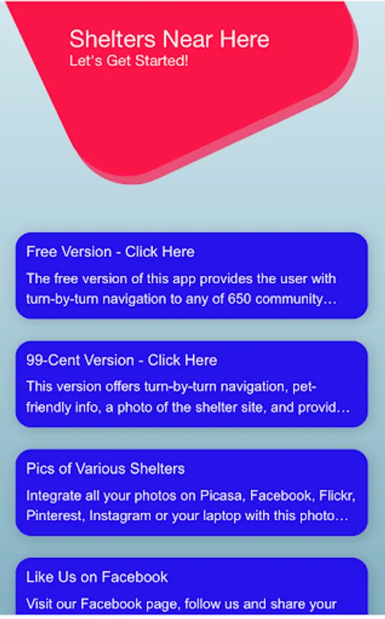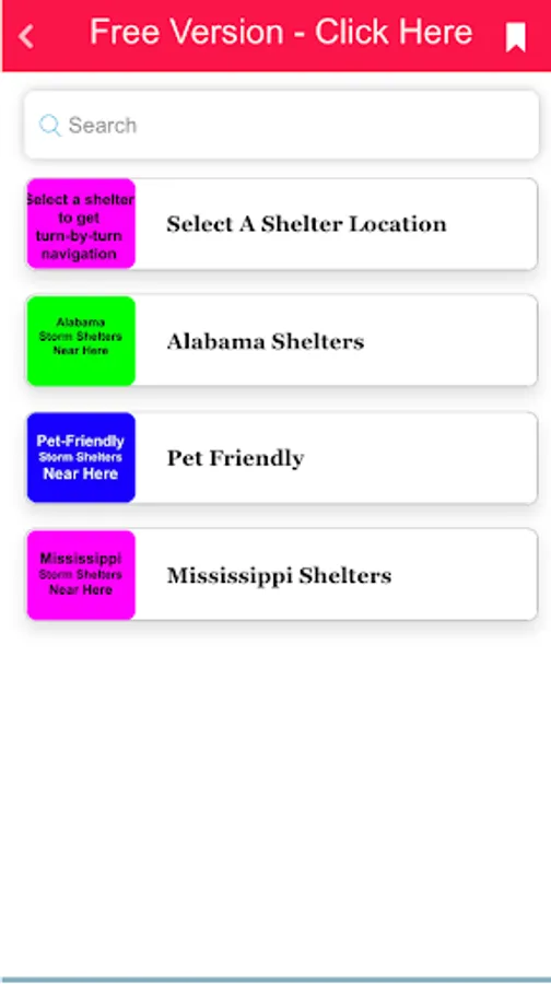 Free version provides travelers with turn-by-turn navigation to public storm shelters. The coverage area includes Alabama and Mississippi. Paid version also provides the shelter type (FEMA or SAFER place), pet-friendly shelter info, and a photo of the shelter site to help orient the user to know what to look for upon arrival.