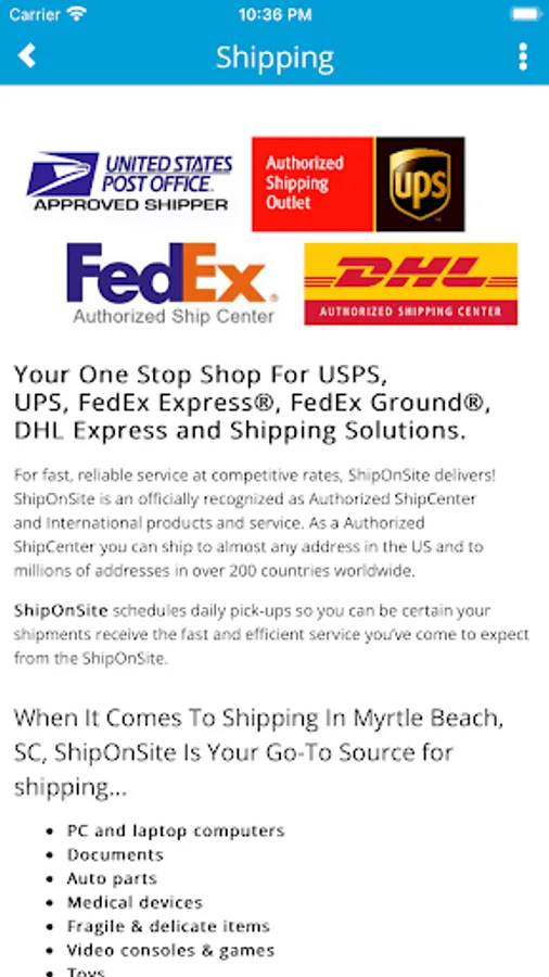 ShipOnSite is your go-to resource for packing, shipping, printing and business service needs of the residents and businesses of Myrtle Beach, SC and its surrounding communities. Voted #1 Shipping Company in the Grand Strand year-after-year, our team of certified trained experts are dedicated in providing you the best service offerings in the Grand Strand. Our app brings our services right to your fingertips with loyalty rewards!