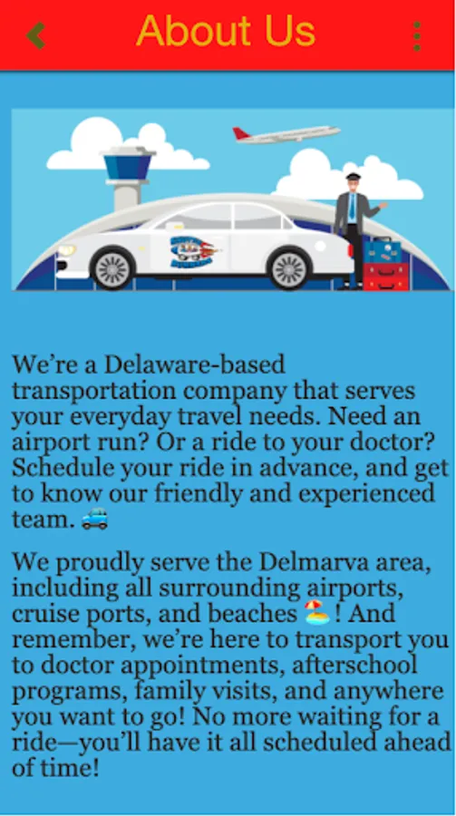 This app connects travelers in need of shuttle services to and from airports for the Delaware and Ocean City areas. The servicing airports are Baltimore Washington (BWI), Reagan National, Dulles Int'l, Philadelphia Int'l and Salisbury Regional. Shuttle Runner's services are private to the purchasing party. Travelers in these regions use this app to prepare ahead for their vacation and/or appointments.