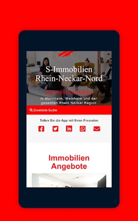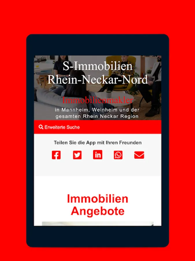 The real estate app of Immobilien Sparkasse Rhein Neckar Nord informs you about current real estate offers for buying and renting in the Rhine Neckar metropolitan region. In addition to our range of real estate in Mannheim, Weinheim and the surrounding area, you have the opportunity to find real estate from the Sparkasse throughout Germany.