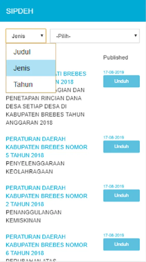 Brebes Regency SIPDEH (Regional Legal Product Information System) is an official application belonging to Brebes Regency which contains information on legal products including: Regent Regulations, Regional Regulations and other legal products. Users search for legal products easily by year, type of legal product or by keyword.