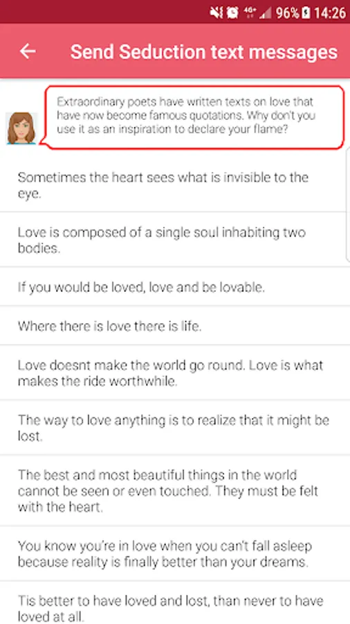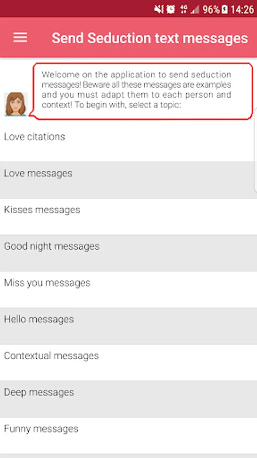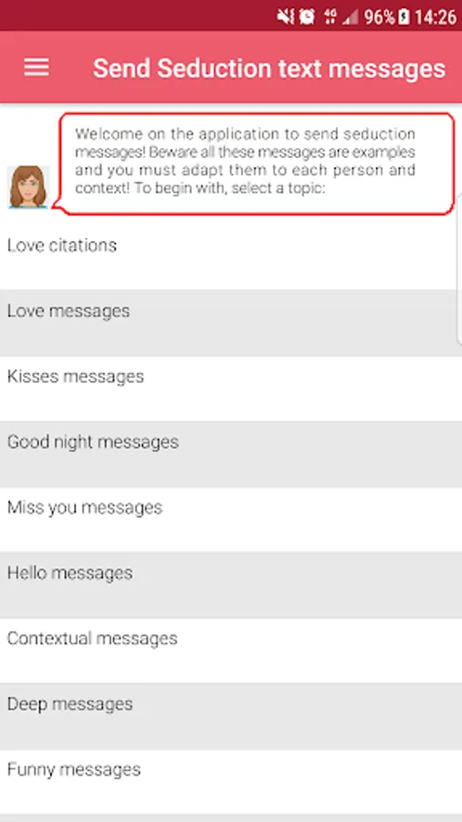 Who never run out of ideas during a conversation with a pretty girl or a handsome guy? To avoid this situation, APP SEDUCTION decided to create more than a 700 pre-registered messages, all sendable directly by email, sms or on social networks (Facebook, Messenger, Whatsapp, Snapchat, Twitter...)