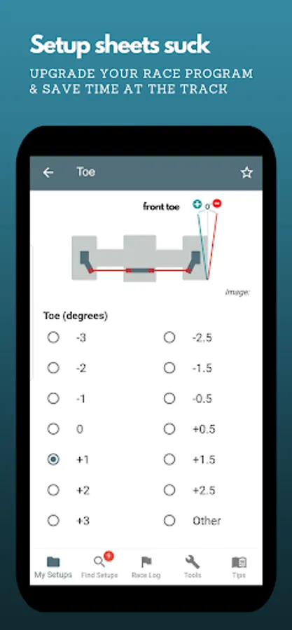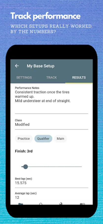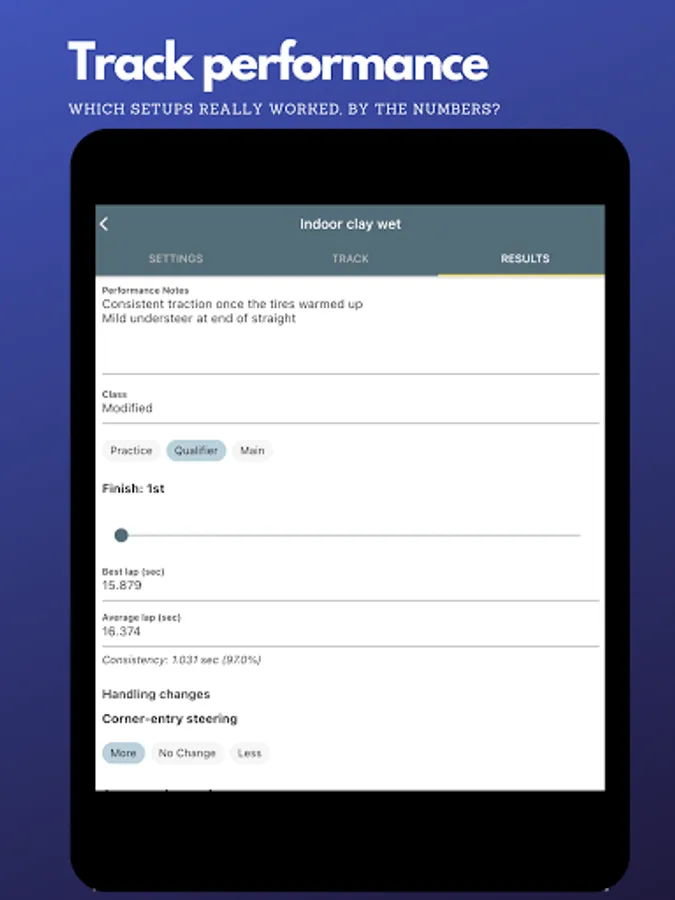 - Race log: easily record your setup changes and test/race results, so they’re always handy on your phone