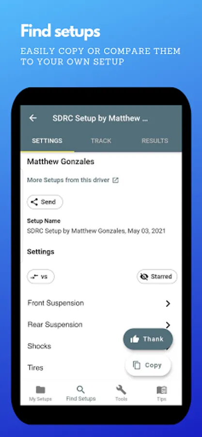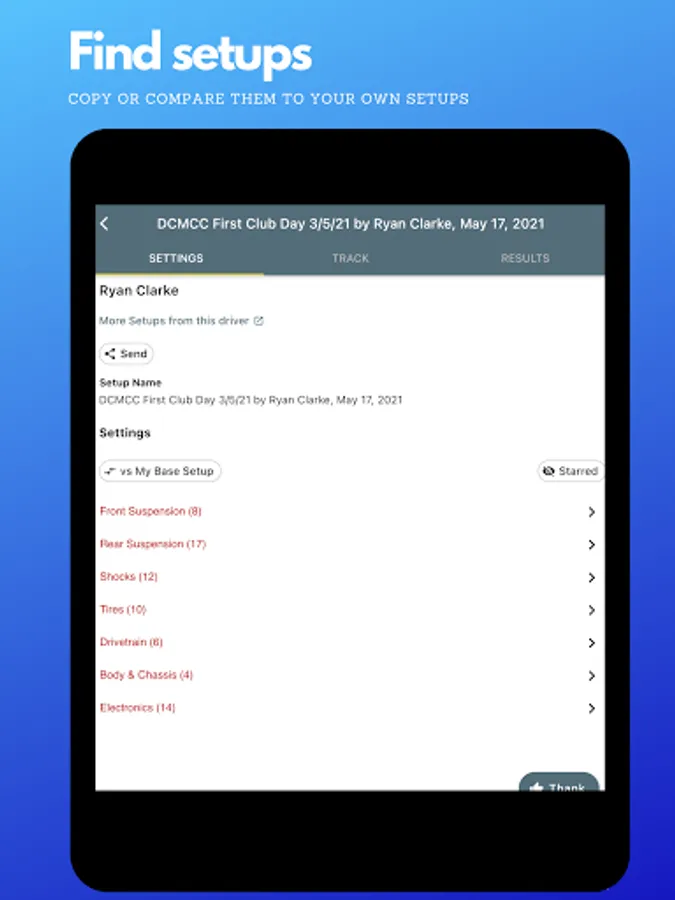 Check out other people’s setups directly in the app (or at www.sodialed.com), and easily compare them to your own setup to get a quick view of what’s different - no need to sift through PDFs. Thank other racers for sharing, and see the most popular shared setups.