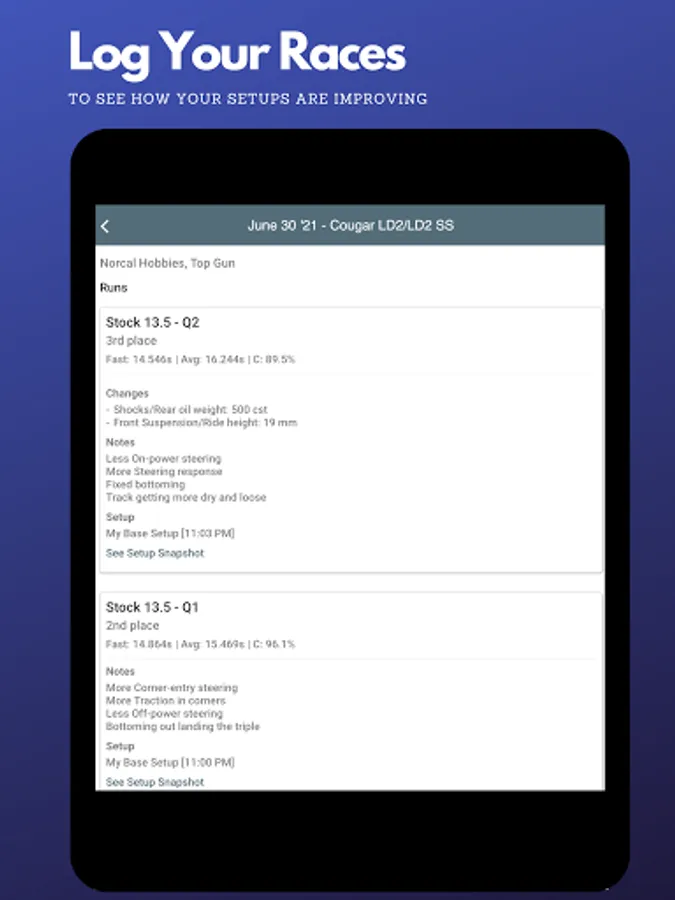 Setup changes are even easier to track now - just change your settings, record your race, and we’ll create a race log so you can see your changes and the results of those changes at a glance without having to create new setup sheets.
