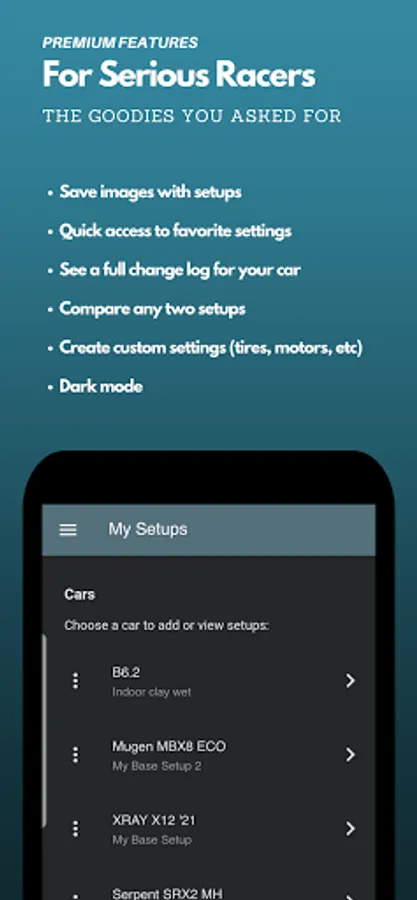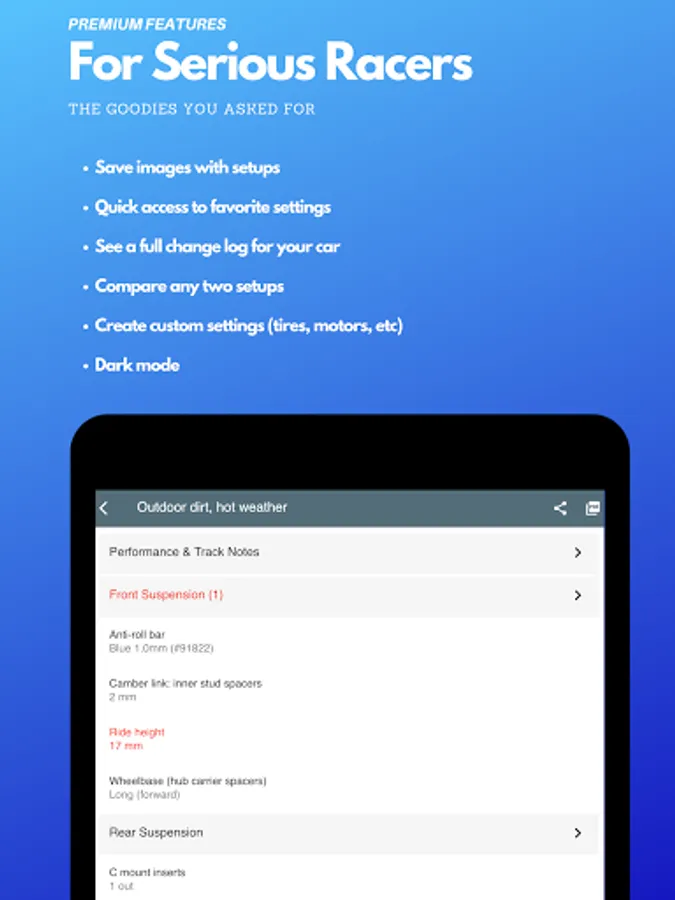 Save your settings for suspension, shocks, drivetrain, tires, differentials, weights, body, motors/engines, electronics, and hop-up parts with just a few taps.