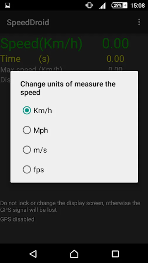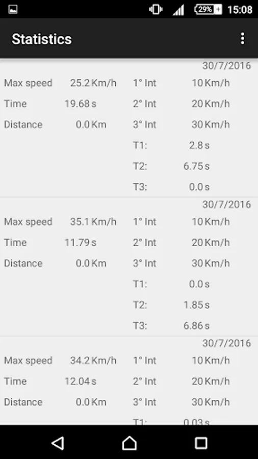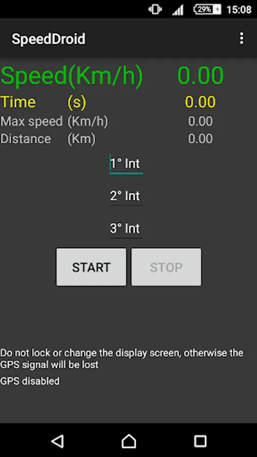 SpeedDroid allows you to monitor important data such as current speed, maximum speed, distance and travel time. It also allows you to measure lap times on accelerating: just set the intervals by inserting in the boxes of the target speed to be monitored (eg. For 0-; 50 just enter 50 in the first box).