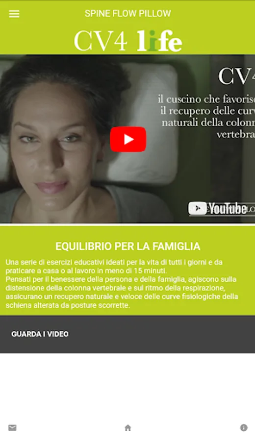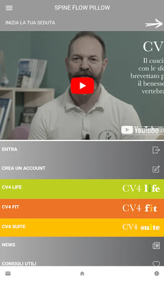 The app Spine Flow Pillow® was created to ensure the best wellness experience in comfort and at your home. Log in with the profile associated with your pillow CV4 (Life, Fit or Suite) and choose the module that interests you: you can immediately start the training session with the exercises dedicated to you.
