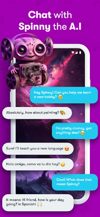 • Talk to your very own A.I. chat friend, Spinny! Powered by ChatGPT.