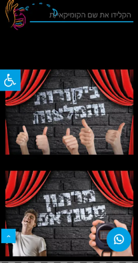 An index of Israeli stand-up comedians, information on all the stand-up performances that take place every day, private performances for all events, clubs, stand-up comedy, courses and workshops, humor and satire books, reviews and recommendations and much more.