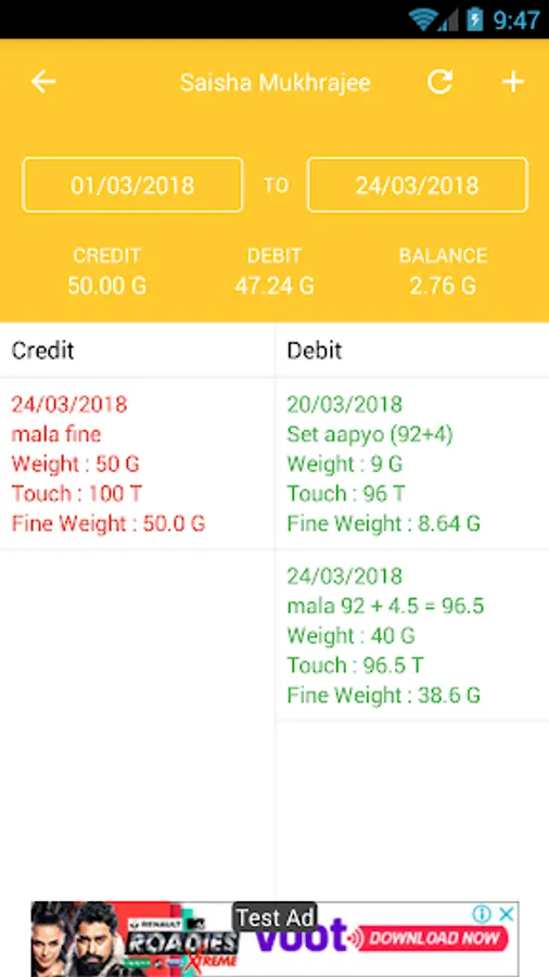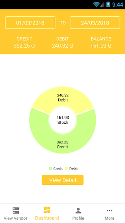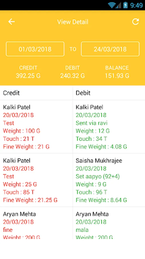 The best app for all the Gold Smiths to fulfill their daily needs like Credits and Debits of Gold or Silver. This app will work like your accounting book so you can see Total Credits and Total Debits from particular vendor as well as from all the vendors date and month wise. Generally all the Gold Smiths do accounting after some particular time like month to month or year to year etc. In this case, you don't have to keep all your papers which you received from your vendor. Just make an entry in this app and this app will remember everything for you and all the information will be accessible on your fingertips within fraction of seconds.