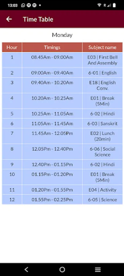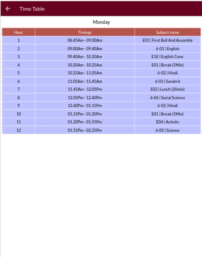 Time Table – To subjects are displayed for the ward according to the Days and times set by the institute