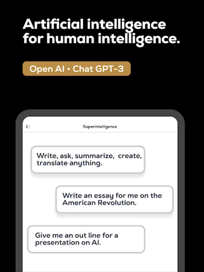 Superintelligence is the ultimate AI chat assistant powered by Open AI’s Chat GPT-4. With Superintelligence you can write emails, essays, blogs, tweets, movie scripts, texts, and much more in seconds. Superintelligence can answer any question you have, summarize text into bullets or keypoints, and even act as a chat friend, interviewer, or even a virtual professor. Whether you need help with research, school, work, or just need someone to bounce ideas off of, Superintelligence is here to help.