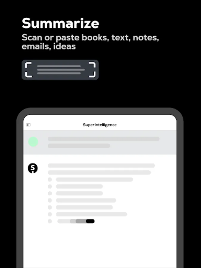 Don't have time to read everything? Superintelligence can help! Just scan or paste books, text, notes, emails, and ideas to get a quick summary, outline, bullet points, or keywords. Superintelligence can alol provide you with a summary of the main ideas, an outline of the structure, bullet points for the key takeaways, or keywords for easy reference. In addition, Superintelligence can help you with extracting insights, important facts, and statistics from the text, making it the perfect tool for data-driven decision making.