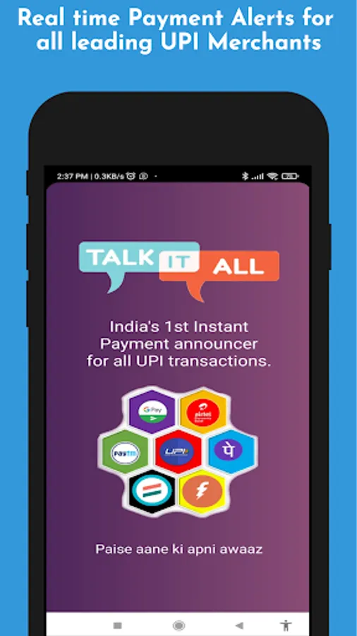 The Talk It All mobile app announces in one single app all the incoming payment information when there's incoming payment into Merchant or Business PayTM app, PhonePe app, Google Pay app.