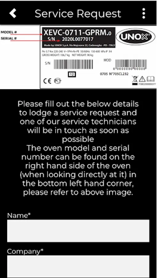 UNOX Australia & New Zealand service request app to book all service enquiries for Unox ovens, including general service, faults, error messages, frozen screen, water filter replacement etc.