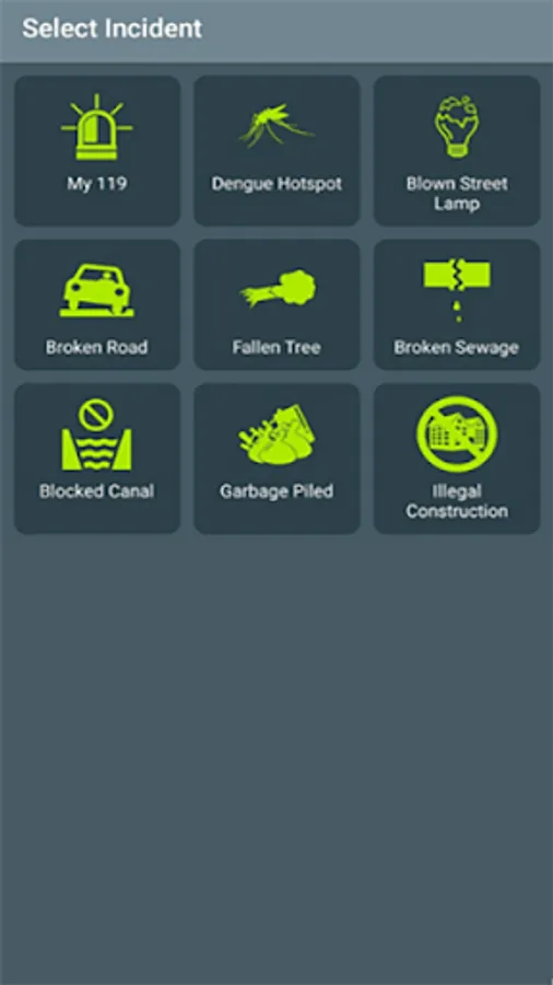 The following incidents can be reported or ask help from the relevant authorities with a single click.