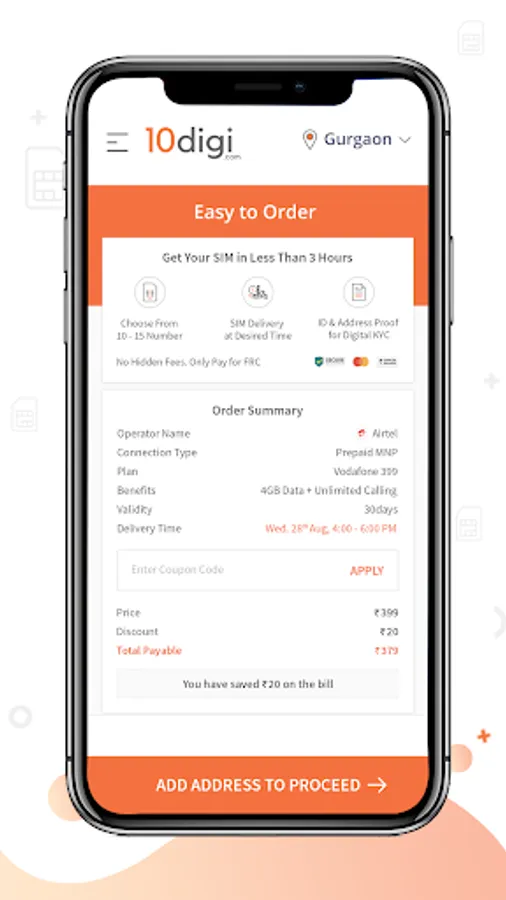 Install 10digi now and get FREE DELIVERY for your new connection or to port your number. We deliver SIM in the locations like: Delhi, New Delhi, Gurgaon, Noida, Mumbai, Pune, Bengaluru, Hyderabad, Jaipur, Mysore, Chennai, Bhopal, Ahmedabad, Nagpur, Nashik, Mangalore, Hubli, Gulbarga, Meerut, Bhubaneswar and many more cities to be added soon.