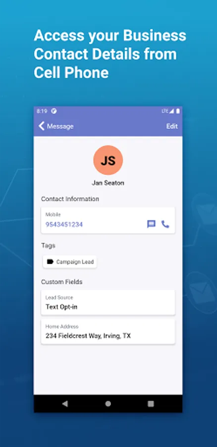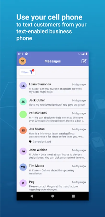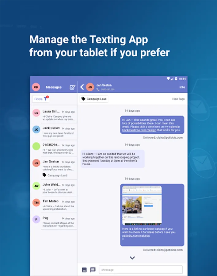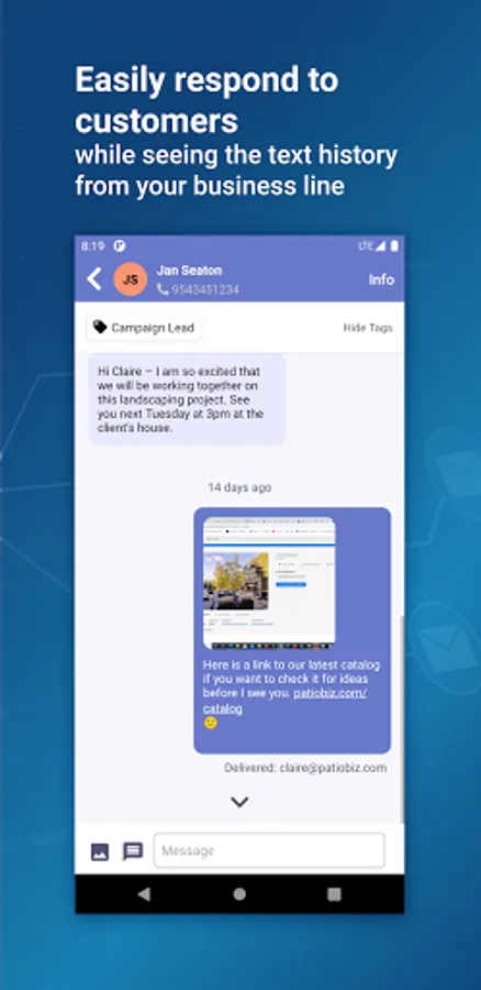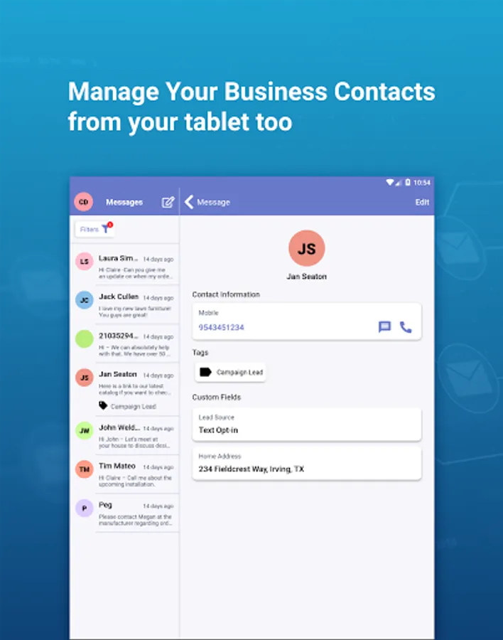 Now with this phone app now you have access to those key features from your cell phone as well and all text communications will be sent using your business number so you never reveal your personal cell phone number again. You have access to your business contacts on the go so you can quickly and easily text your customers while seeing previous text conversations too and you can filter customers using tags making it even more convenient.