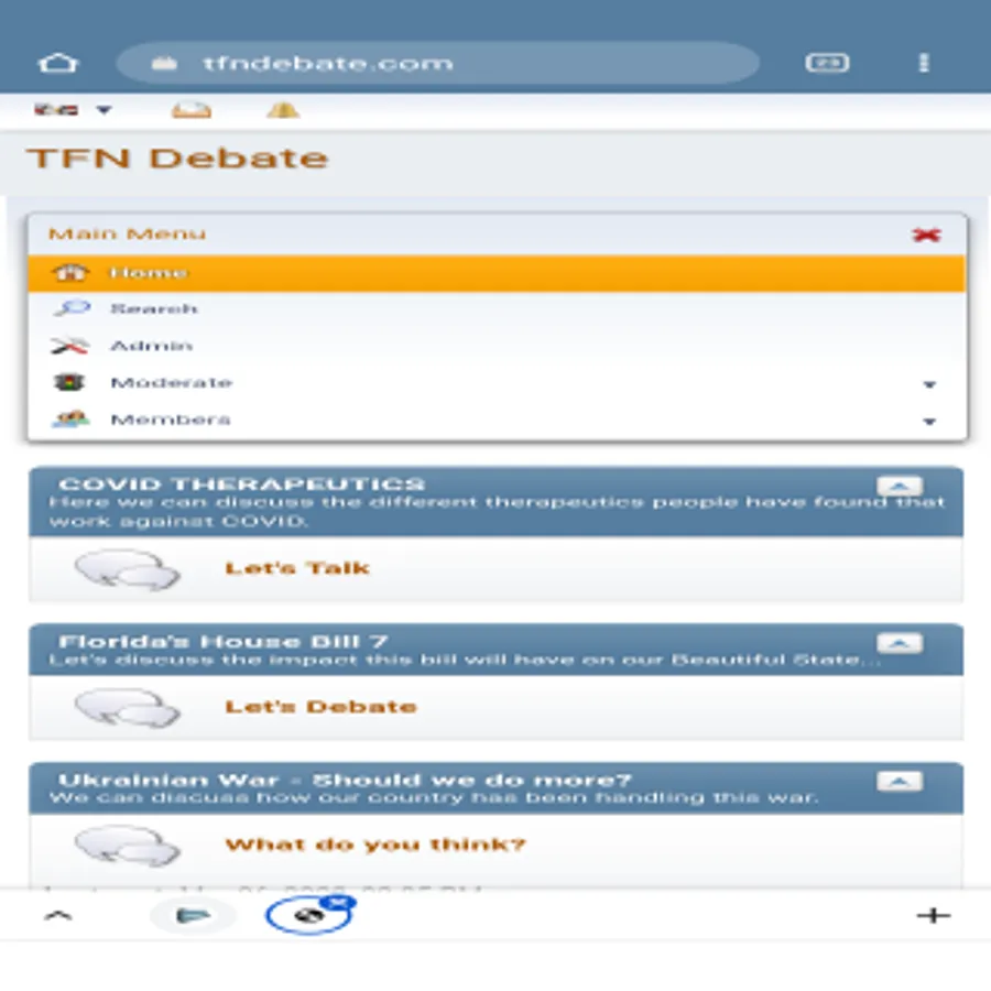 TFN Debate is a platform where you can debate various topics. Debates can be done via text or video.