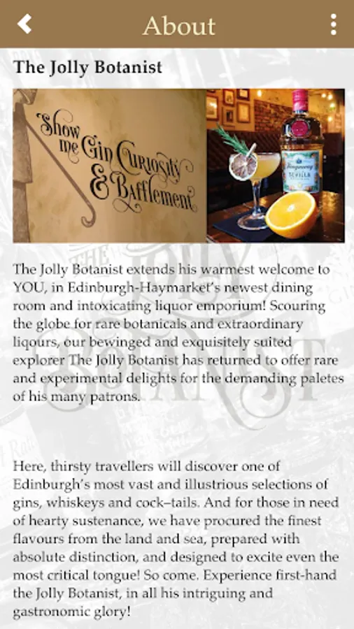 Here, thirsty travellers will discover one of Edinburgh’s most vast and illustrious selections of gins, whiskeys and cock–tails. And for those in need of hearty sustenance, we have procured the finest flavours from the land and sea, prepared with absolute distinction, and designed to excite even the most critical tongue! So come. Experience first-hand the Jolly Botanist, in all his intriguing and gastronomic glory!