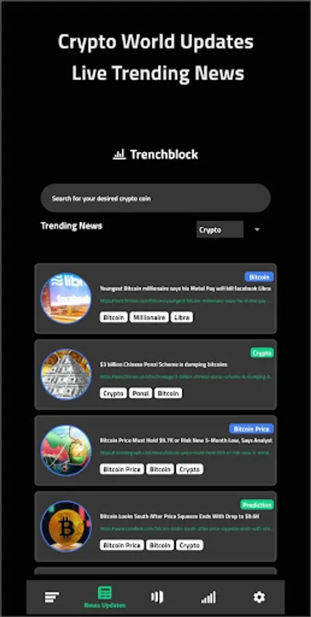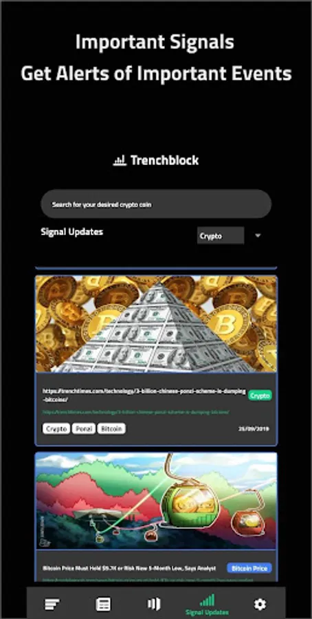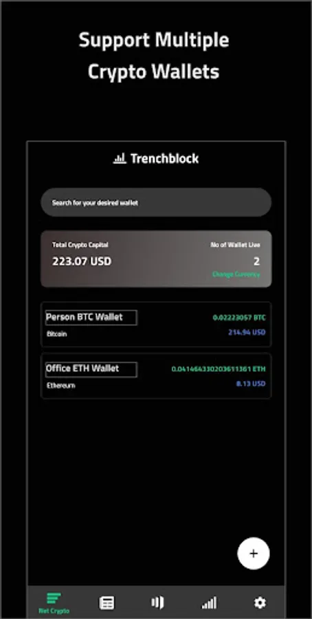 TrenchBlock is am amazing tool which is absolutely free, that allows you to keep track of all of your crypto assets at one place. With the ability to get live rates and updates from Crypto Exchanges TrenchBlock provides you all the benefits in a single place. TrenchBlocks provide FREE Bitcoin & other cryptocurrency market updates from exchanges realtime. Moving wallets to a new app can be highly insecure and you may want to avoid it at every possible level, with Trenchtimes you can keep your wallets in any place you like and still have the ability to see what's going on in the wallets. Like incoming and outgoing transactions, your current crypto value and rates in multiple fiat currencies also get detailed crypto price and market information and receive Signal updates directly from crypto team leaders. Bitcoin price tracking made easy with this crypto tracking app.