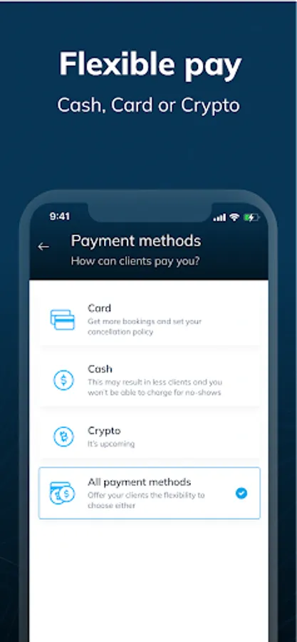 - Accept: Cash, Card, Apple Pay or Cryptocurrency
