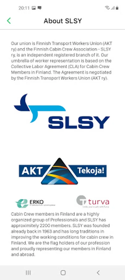 SLSY is an independent registered branch of the Finnish Transport Workers Union (AKT ry). Our umbrella of worker representation is based on the Collective Labor Agreement (CLA) for Cabin Crew Members in Finland.